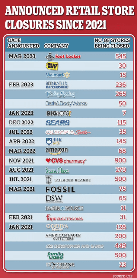 自 2021 年以来,TargetBest BuySearsFoot Locker 和 CVS 等主要品牌的近5,000 家店面已经在全国范围内关闭,投资银行瑞银预计到2027年将有 50,000 家商店关闭。除了破产加速,近日,美国经济还显示出一系列其它令人不安的迹象,例如大规模裁员、银行贷款降温。今年以来,Meta、谷歌、微软等科技巨头均抛出裁员计划,裁员潮当前已经蔓延至消费业。
